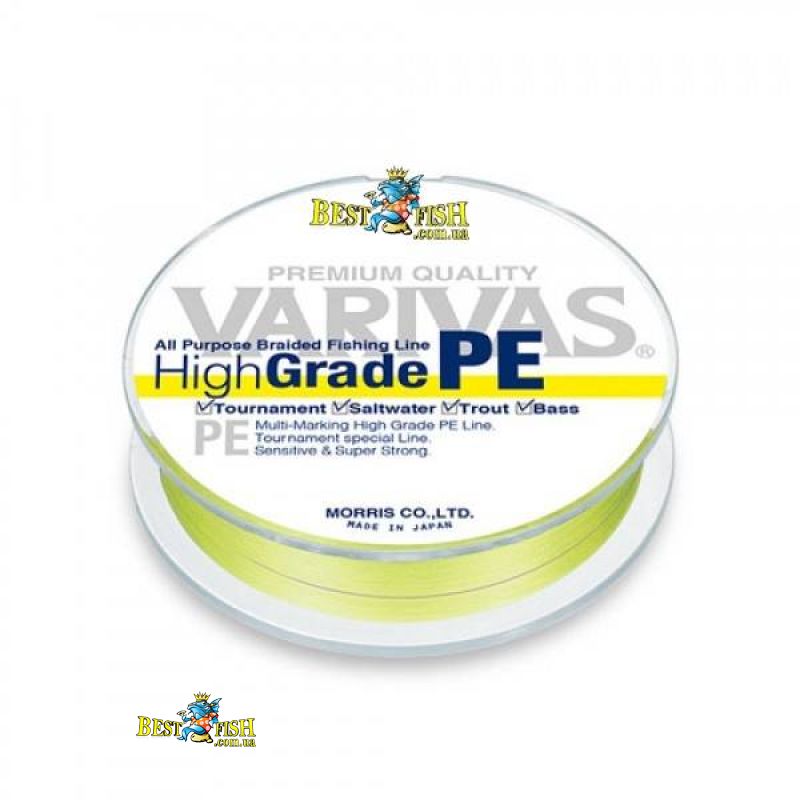 Varivas High Grade Yellow Плетеный четырехжильный Pe шнур с круглым сечением, желтого цвета. Шнур произведен в Японии. Достаточно абразивоустойчивый, с минимальной растяжимостью за доступную цену. Отличный выбор для спиннинговой рыбалки на джиг, твич и пр.