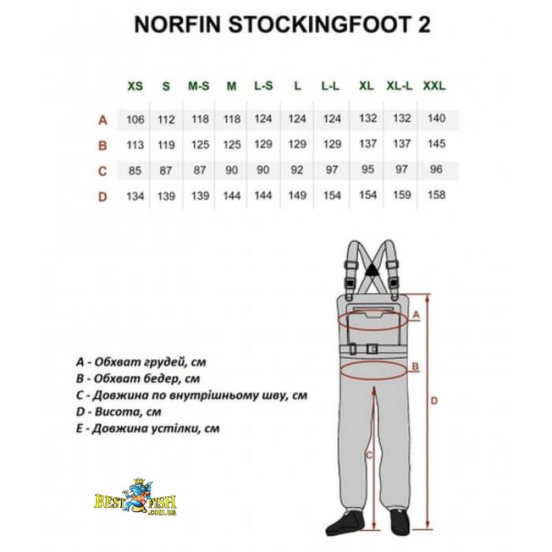 Забродний напівкомбінезон виготовлений з високоякісного чотиришарового «дихаючого» мембранного матеріалу. Мінімальна кількість швів, зручний крій, ідеальний баланс між міцністю, водонепроникністю та «дихаючими» властивостями. Шкарпетки виготовлені із щільного зносостійкого неопрену, товщиною 5 мм.
