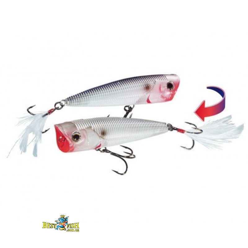 Поппер от японского концерна DuelYo-Zuri Sashimi Popper F1064. Длина данной приманки – 75 миллиметров, вес – 10 грамм. Данная приманка сочетает в себе два запатентованных решения от компании – Wawe motion и Color Change. Первое решение заключается в ребристости корпуса, который при проводке создает дополнительные колебания, второе – изменение цвета при преломлении светового потока. Поппер идеально сбалансирован, используя его не составит большого труда произвести существенный всплеск, хвост приманки оснащен пульсирующими при проводке перьями. Техники проводки стандартны для такого рода приманок – традиционная попперная проводка и, благодаря горизонтальному расположению приманки в воде, волкерная «выгул собаки».