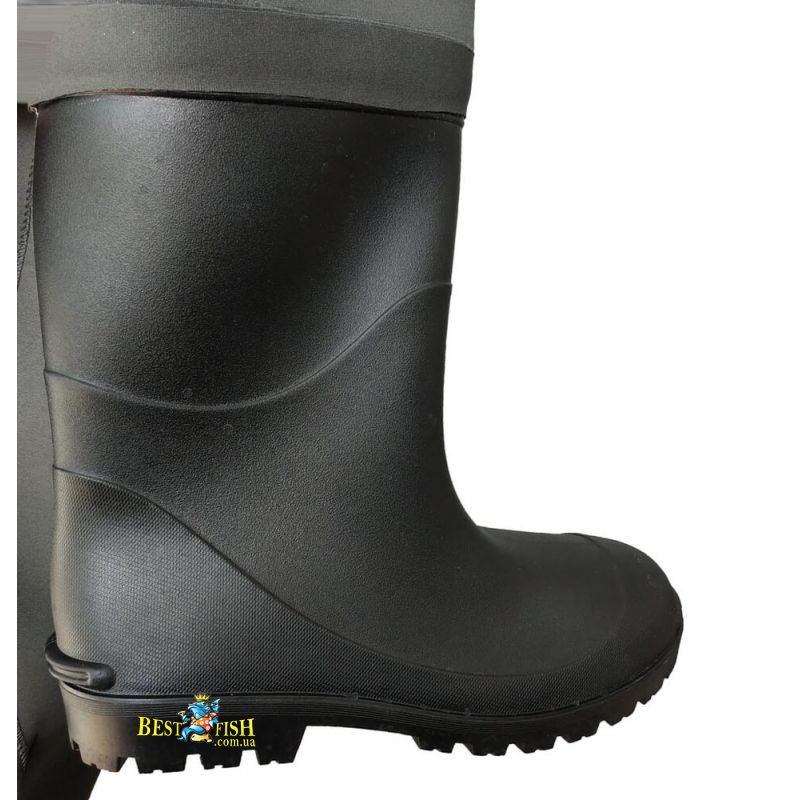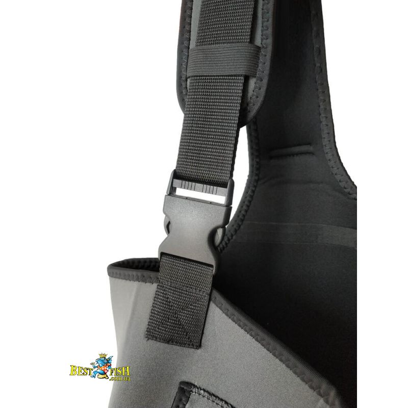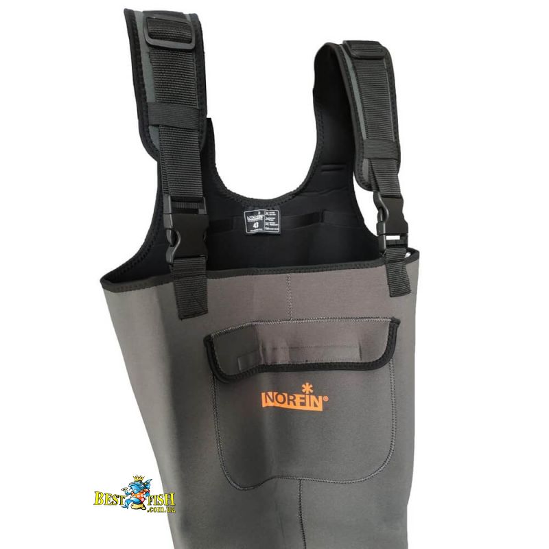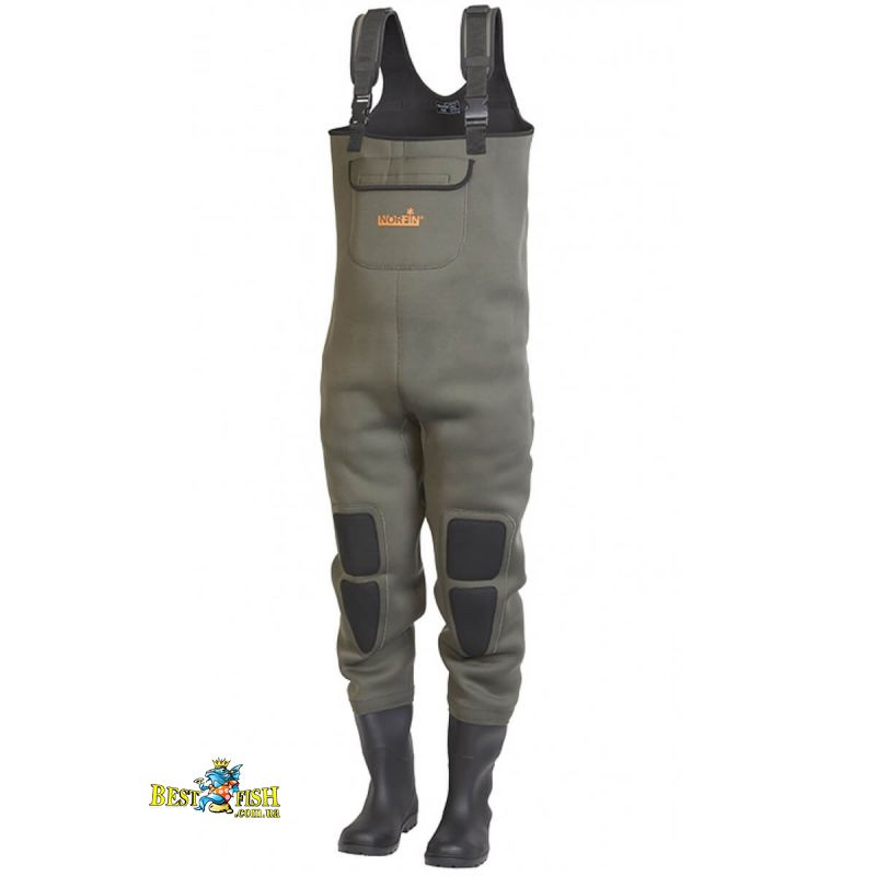Верхня частина вейдерсов Norfin Freewater зроблена з міцного неопрена товщиною 3 мм з конструкцією hi-back Верхньої для глибокого занурення. Чоботи виготовлені з легкого ПВХ. Неопреновие ремені. Є передній кишеню, посилені коліна.
