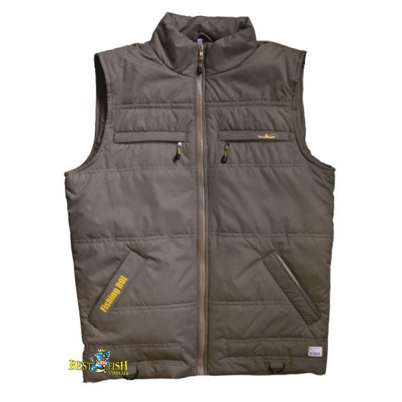 Жилетка Fishing ROI сафарі оливкового кольору. Матеріал паропроницаемий поліестер з ПВХ напиленням, утеплювач Hollowfiber-100. Чотири зовнішні кишені (на змійці), дві внутрішні кишені, один на змійці, додатковий для телефону.